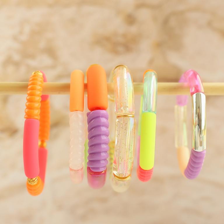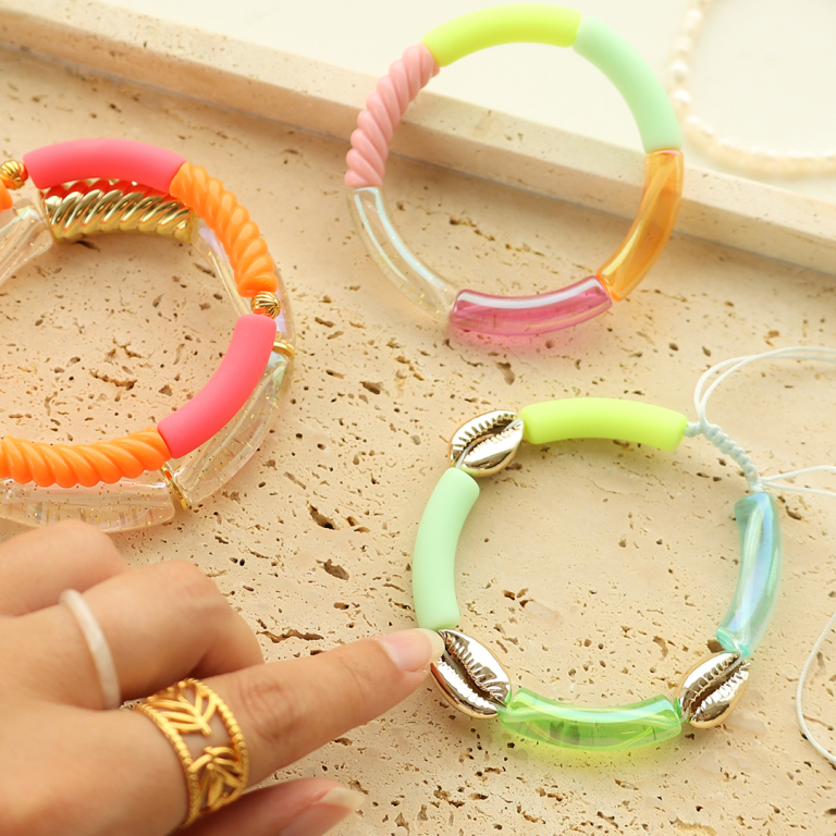 Deze nieuwe serie tube acryl kralen mat summer en AB coating is perfect voor het ontwerpen van kleurrijke armbanden. Rijg de armbanden op elastiek draad of macramé draad en combineer met bijvoorbeeld kauri schelpen voor een prachtige zomerse look!