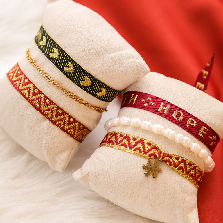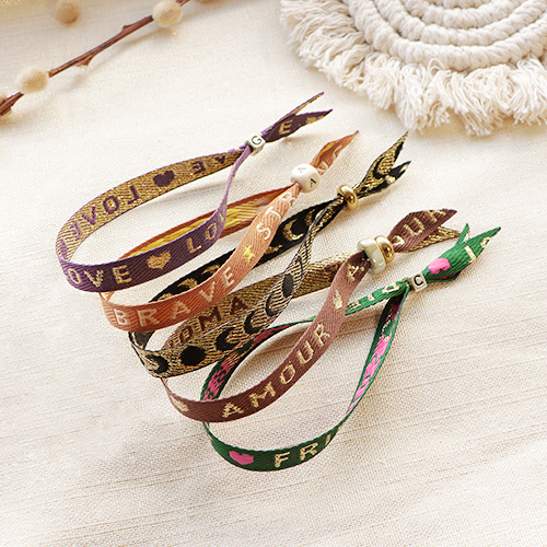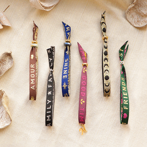 Wanneer je lint netjes op de goede lengte wilt knippen, gebruik jede Beadsmith knoop tang. Voordat je de armbanden sluit met kralen zoals houten letterkralen, kun je ze versieren met een mooie bedel. Dit lint is perfect voor het ontwerpen van chokers, die je mooi afwerkt met lintklemmen en een verlengketting. Maak smalle armbanden van Miyuki rocailles die je samen met de armbanden van lint op een sieraden kaartje presenteert. Deze kaartjes passen precies in een velvet sieradenzakje.